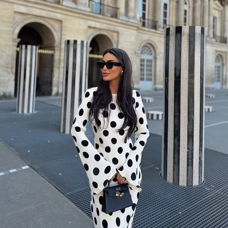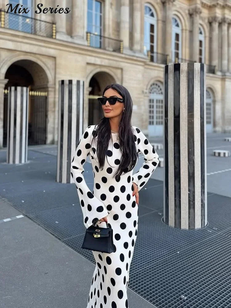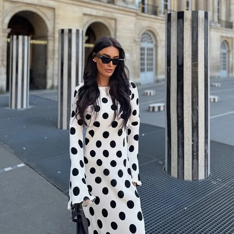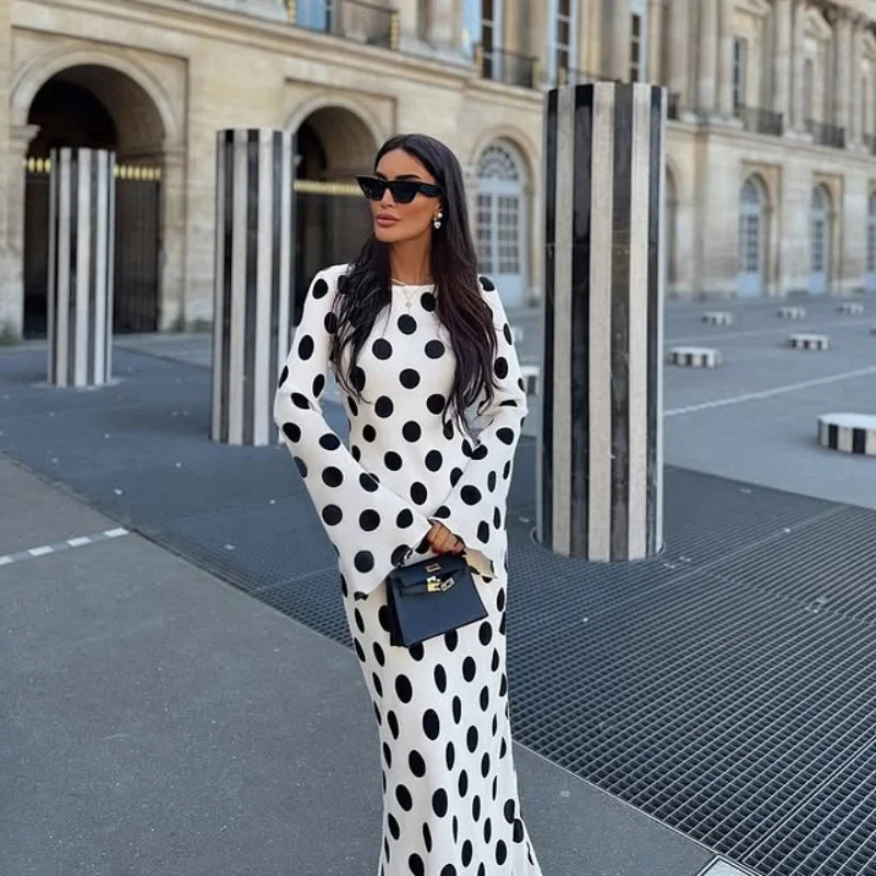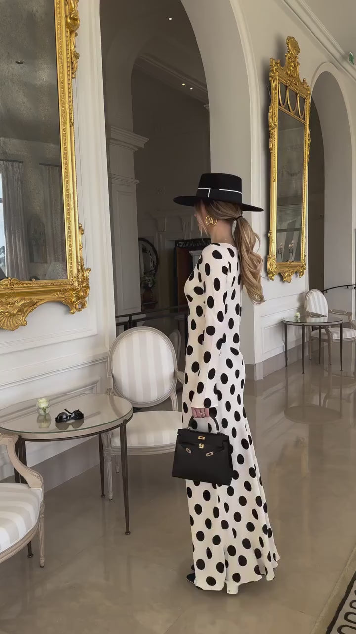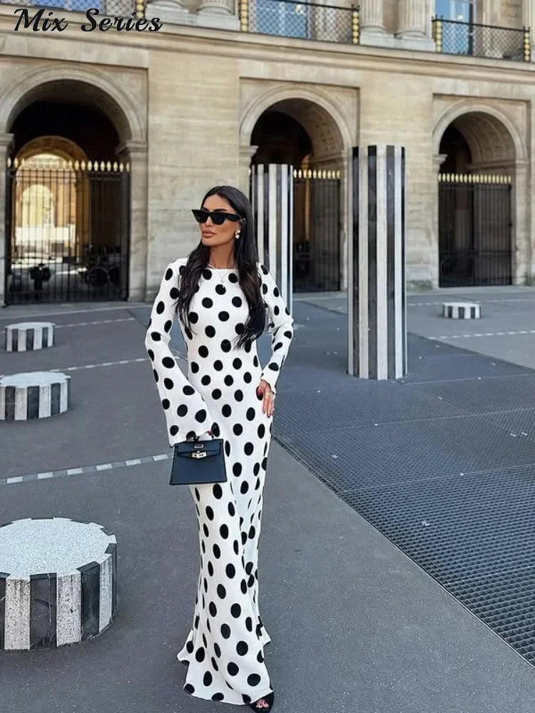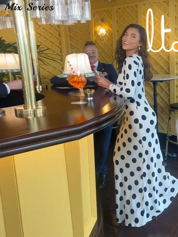 Step into timeless elegance with this floor-length polka dot dress, designed to flatter with its slim fit and high-waisted silhouette. Featuring full-length sleeves and a graceful, body-hugging cut, this dress combines a retro vibe with modern style. Made from soft polyester fabric with a slight stretch, it ensures comfort while maintaining a sleek look.