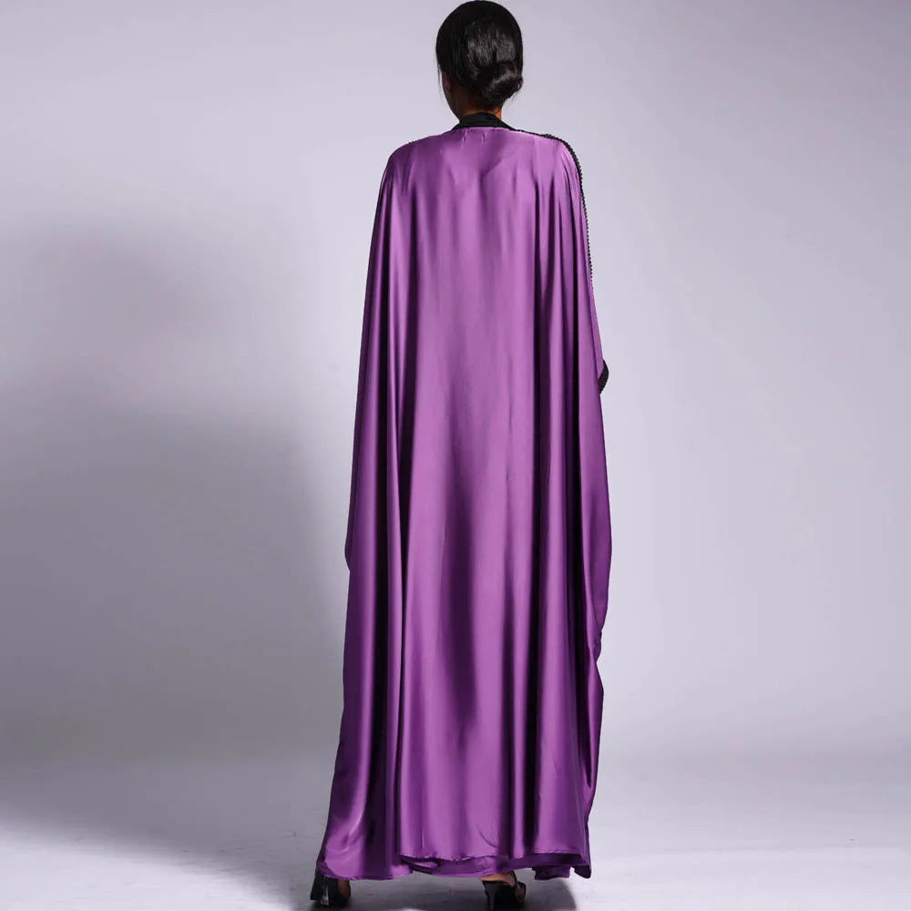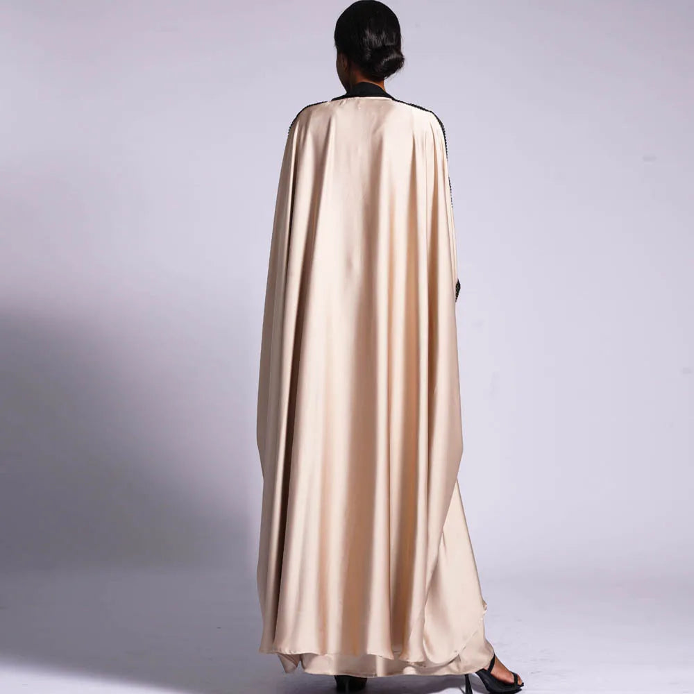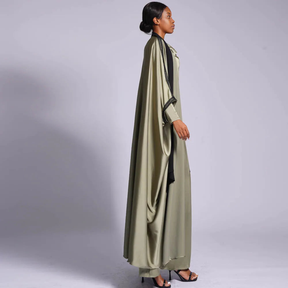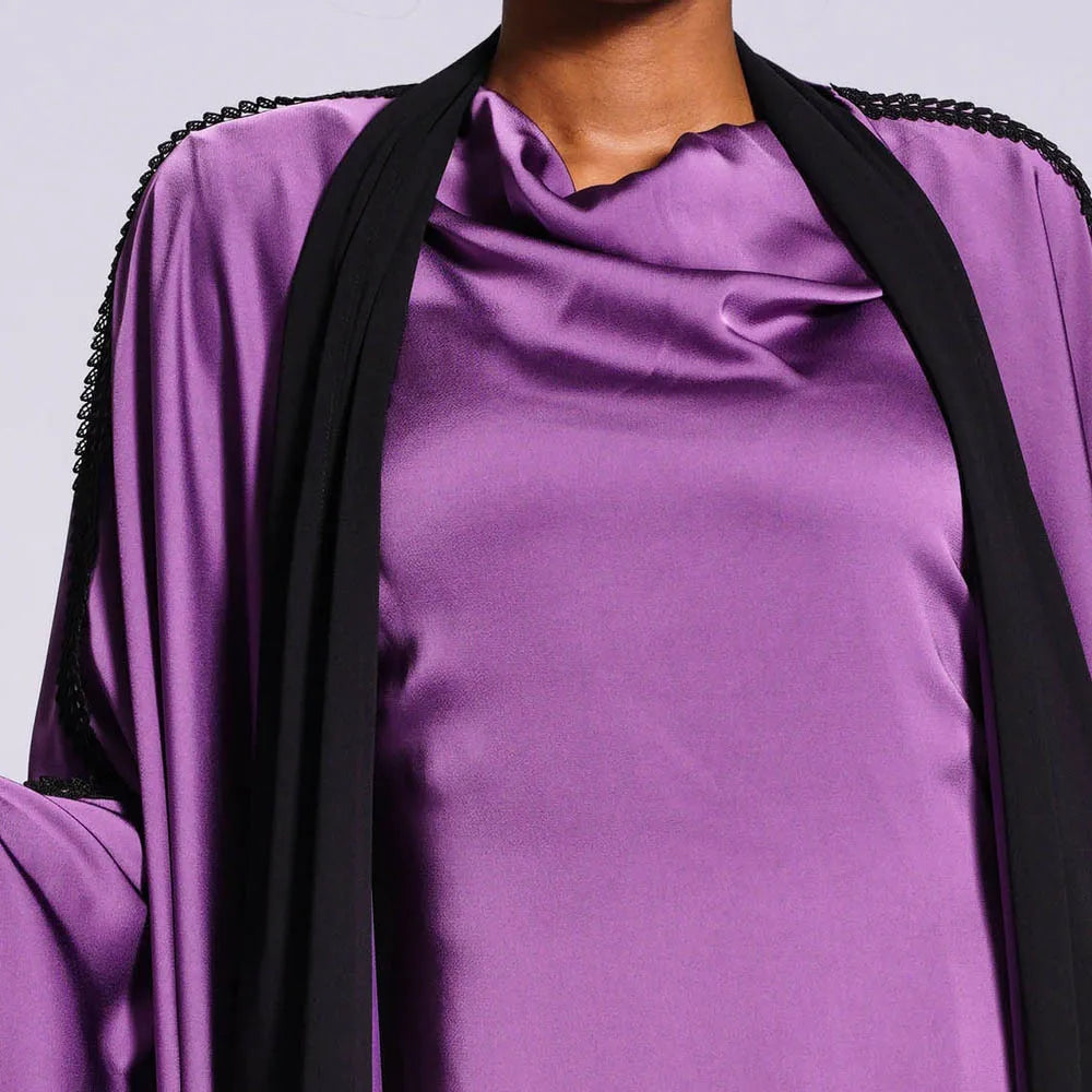 The kaftan-style top with V-shaped bat sleeves provides a relaxed yet refined silhouette, while the intricate lace detailing adds a touch of femininity and grace. The pleated bottom flows beautifully for a fluid, graceful look, making this abaya ideal for formal events, religious occasions, or casual gatherings where style matters.