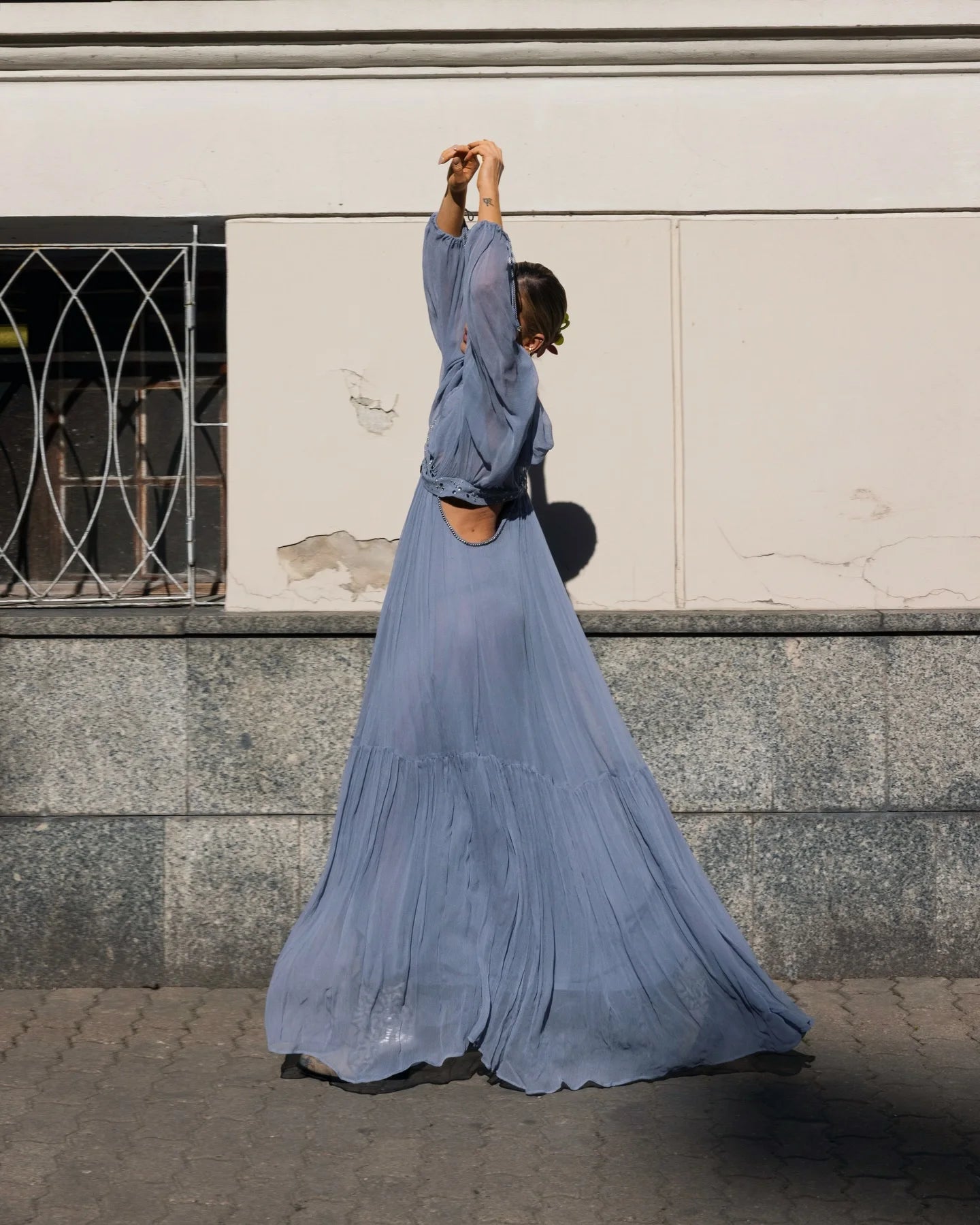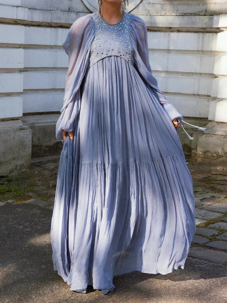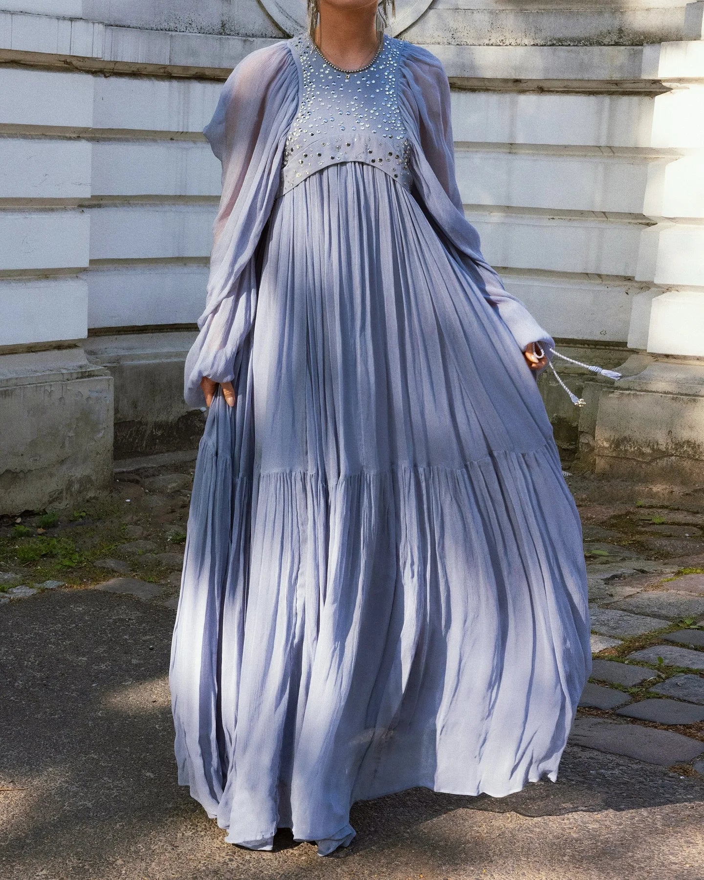 Pleated Puff Sleeve Maxi Dress – V-Neck, A-Line Silhouette