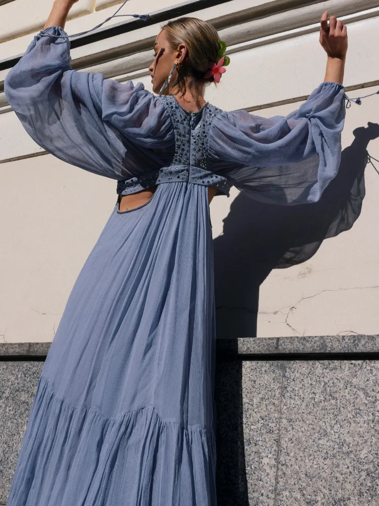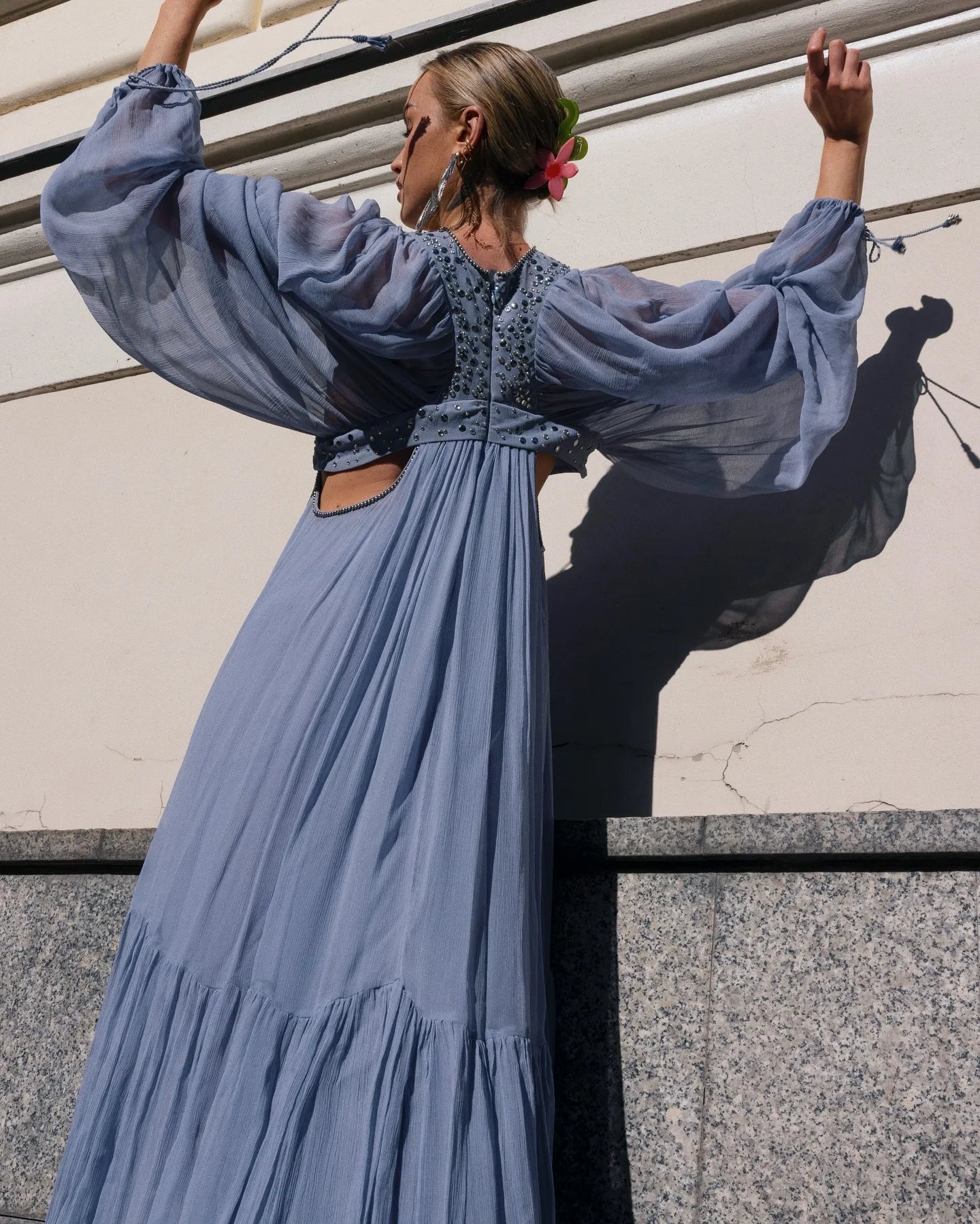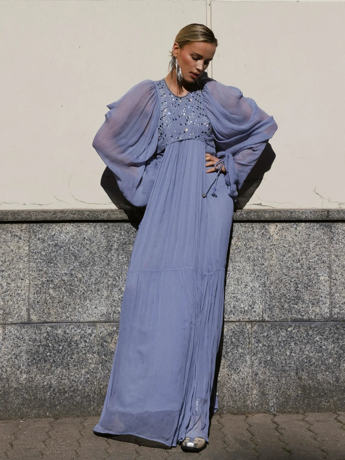 Pleated Puff Sleeve Maxi Dress – V-Neck, A-Line Silhouette