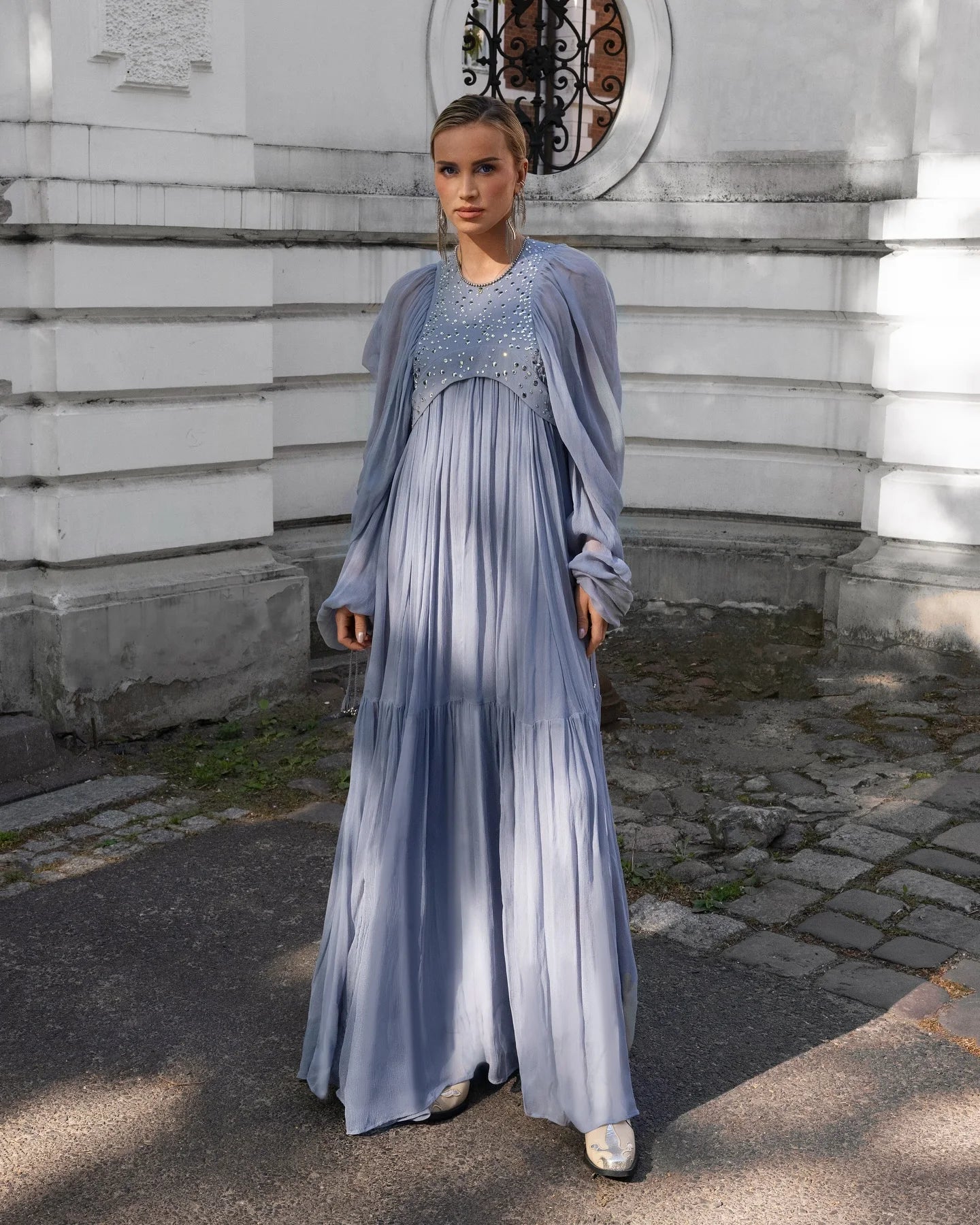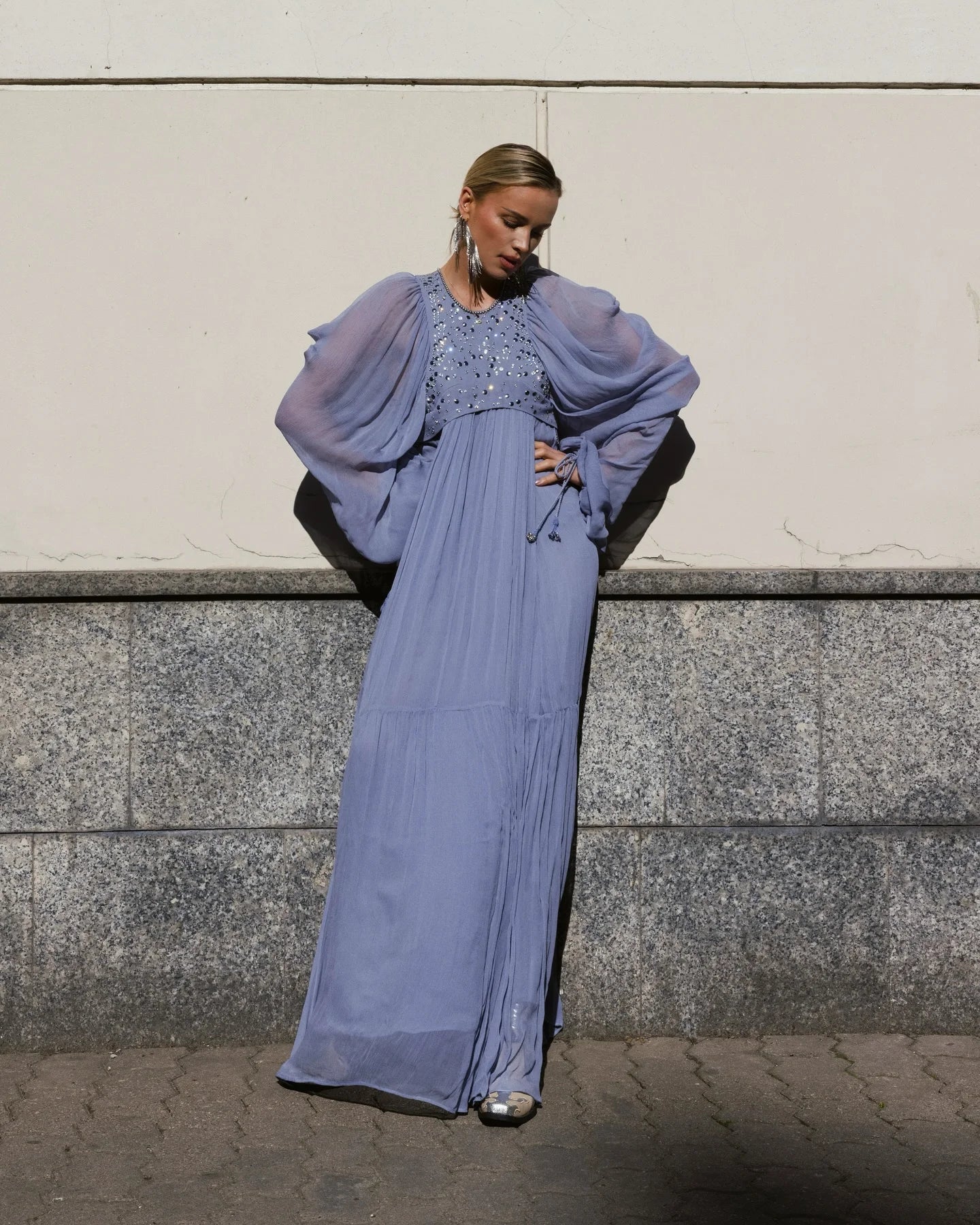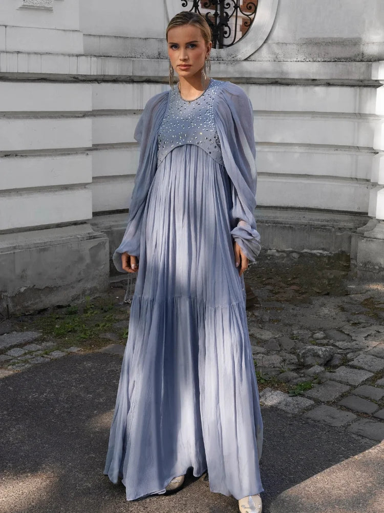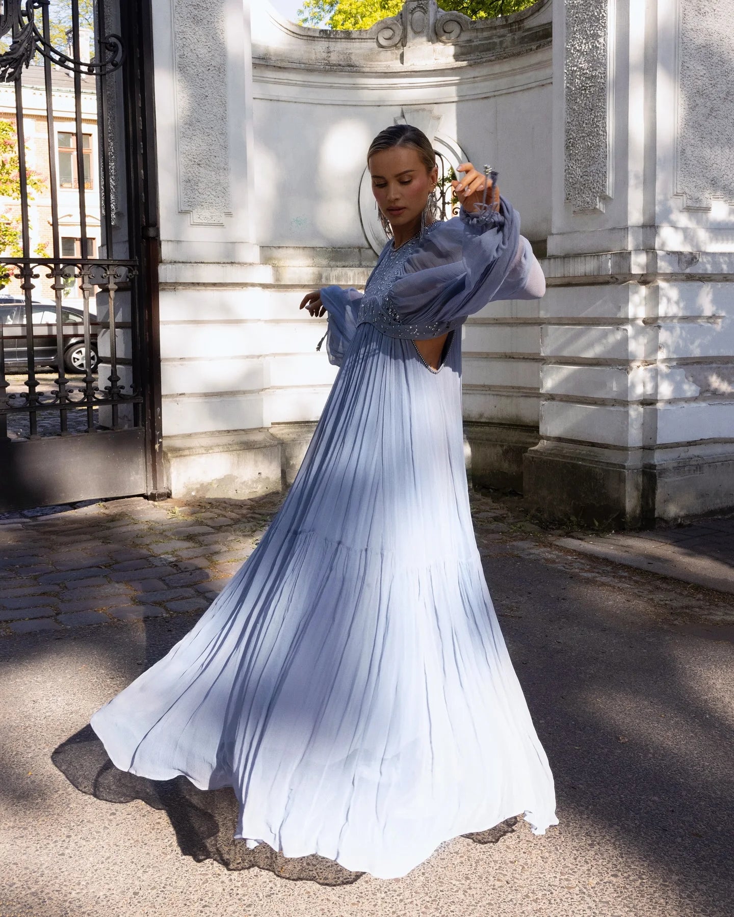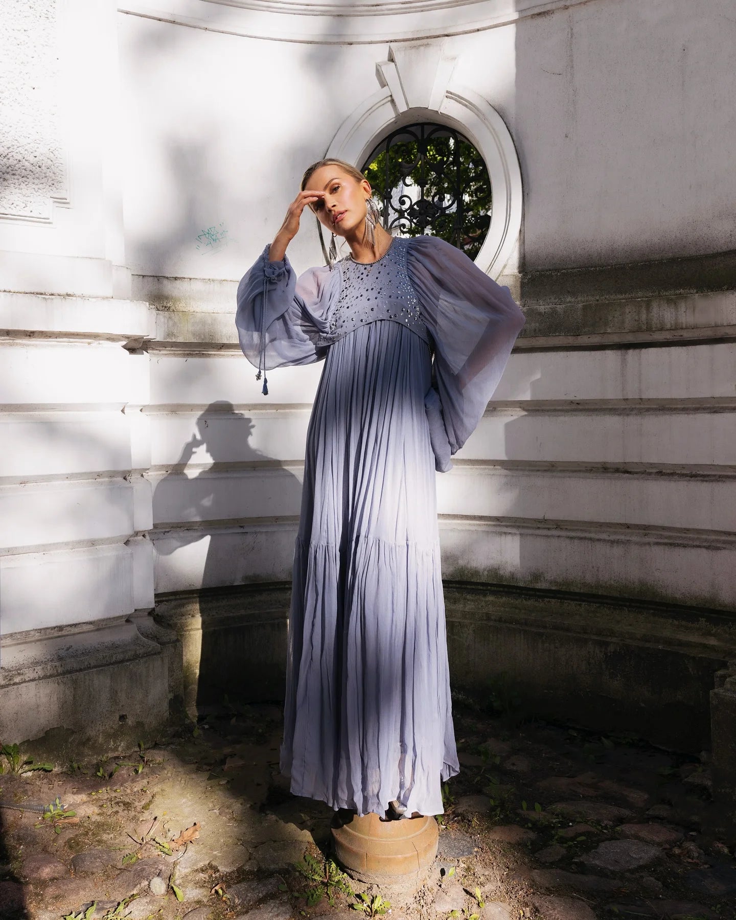 Graceful and effortlessly chic, this ankle-length pleated dress features elegant long puff sleeves and a flattering V-neckline. Designed in a classic A-line silhouette with a loose fit, it offers a comfortable yet sophisticated look for any occasion. Crafted from soft polyester with a slight stretch, it moves beautifully and feels light on the skin.