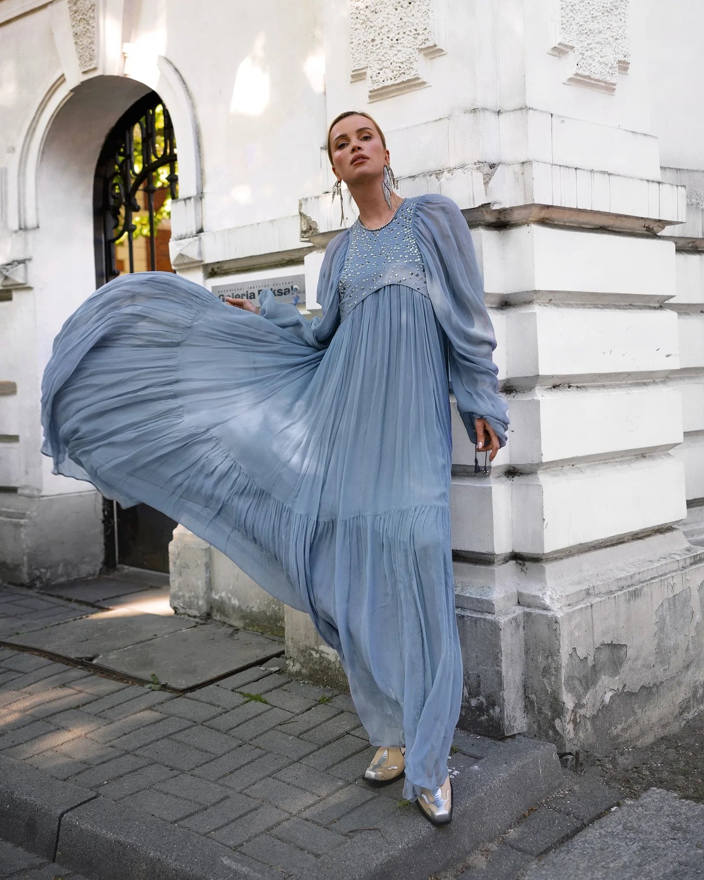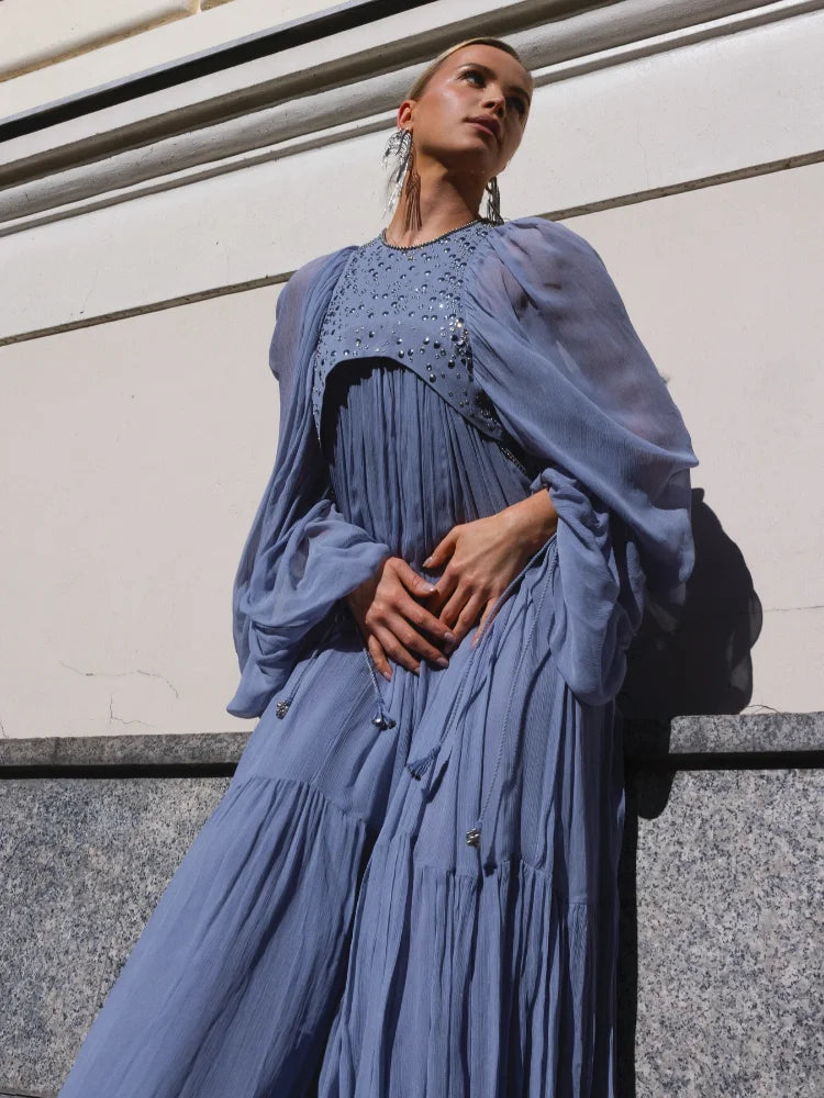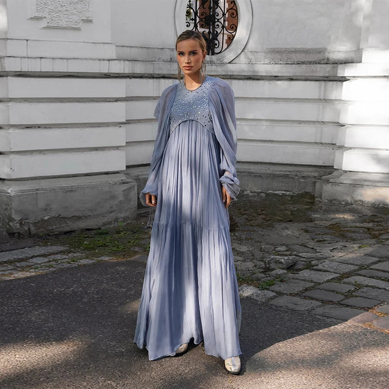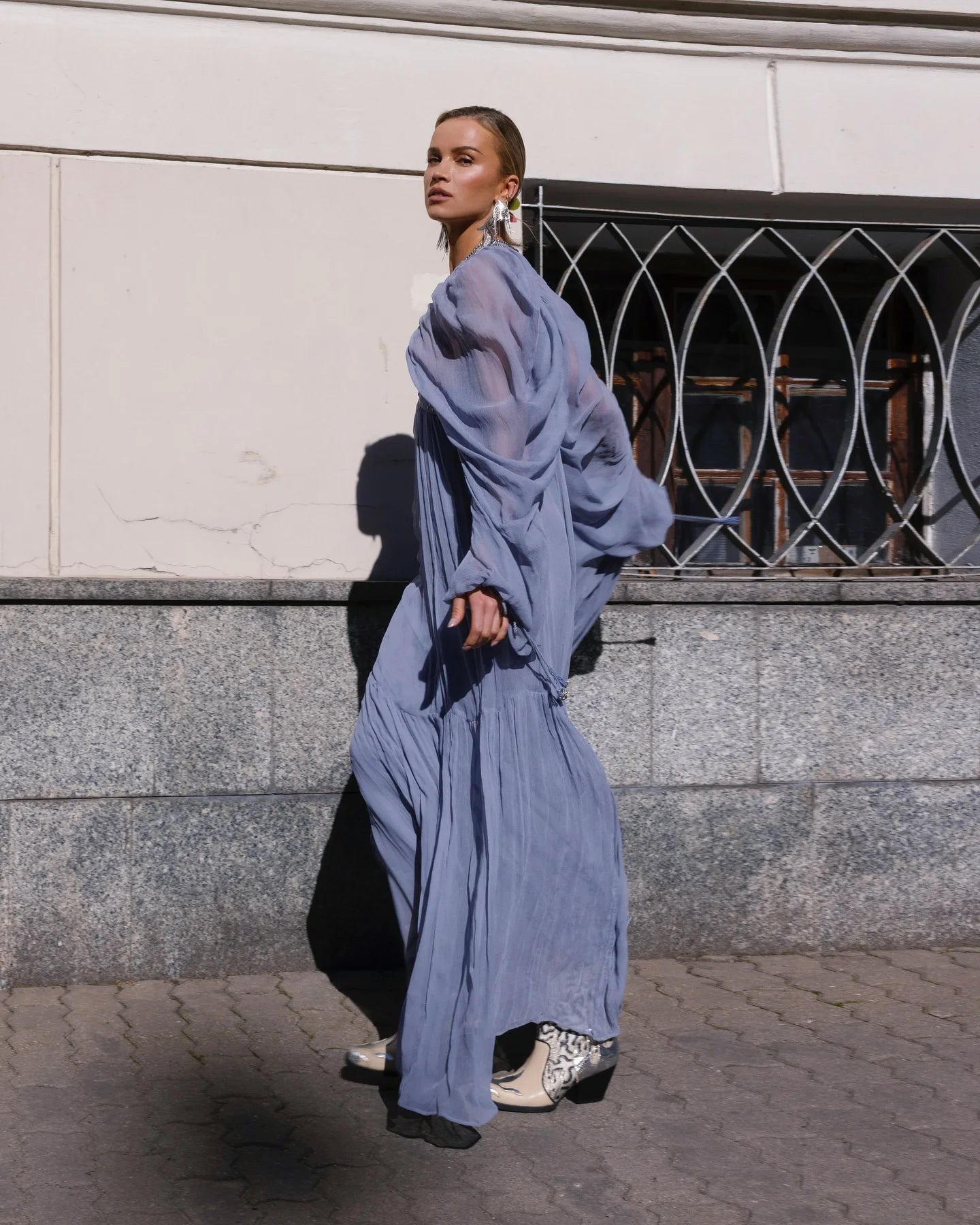 Graceful and effortlessly chic, this ankle-length pleated dress features elegant long puff sleeves and a flattering V-neckline. Designed in a classic A-line silhouette with a loose fit, it offers a comfortable yet sophisticated look for any occasion. Crafted from soft polyester with a slight stretch, it moves beautifully and feels light on the skin.