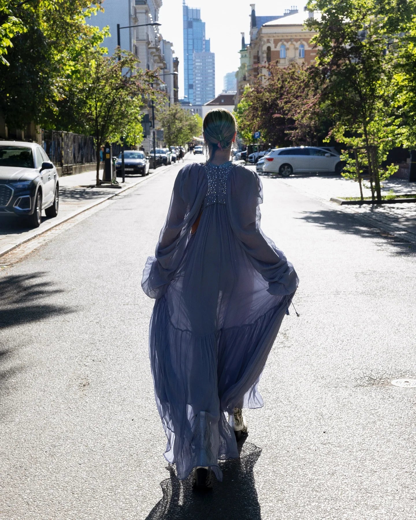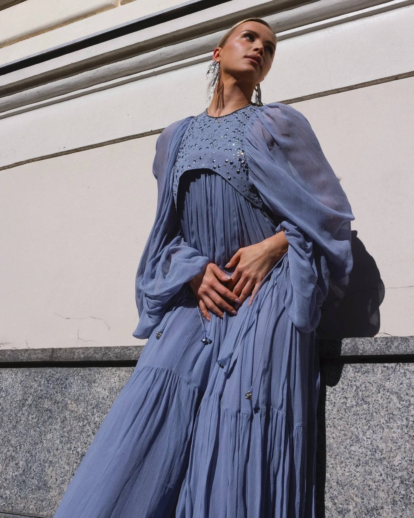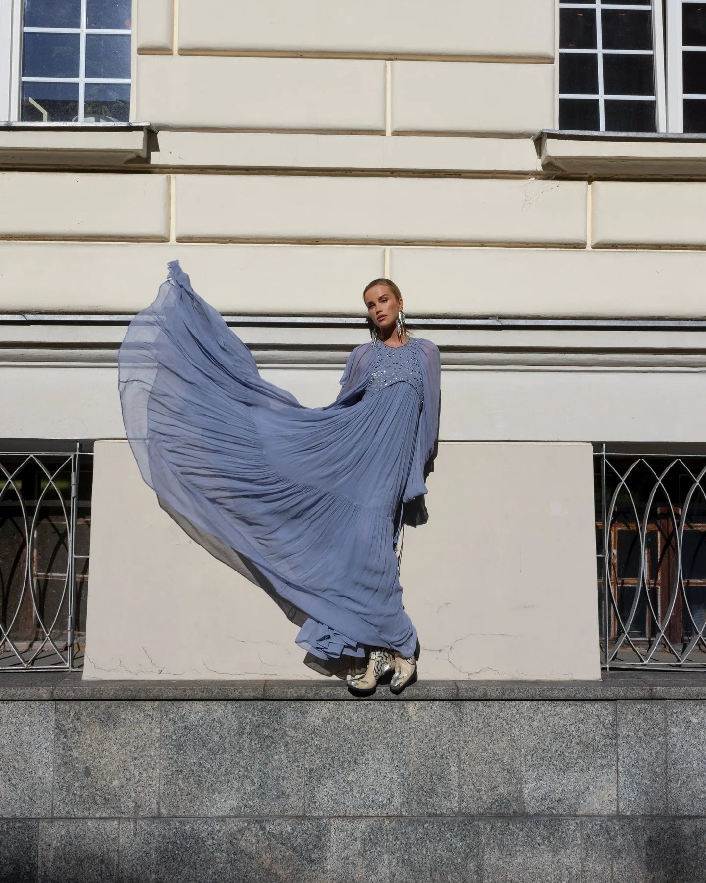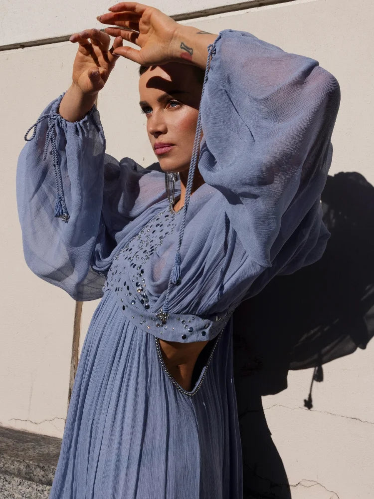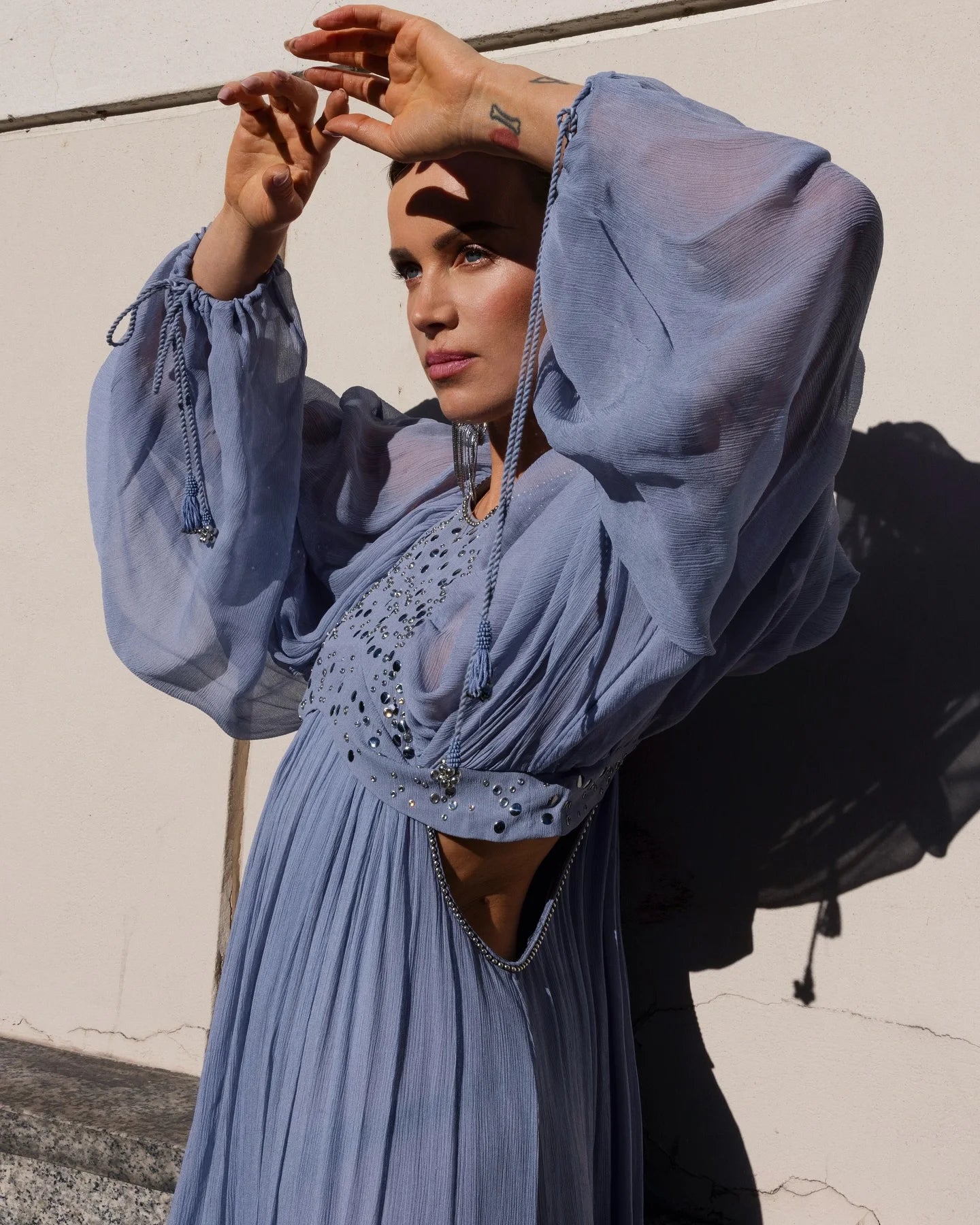 Graceful and effortlessly chic, this ankle-length pleated dress features elegant long puff sleeves and a flattering V-neckline. Designed in a classic A-line silhouette with a loose fit, it offers a comfortable yet sophisticated look for any occasion. Crafted from soft polyester with a slight stretch, it moves beautifully and feels light on the skin.